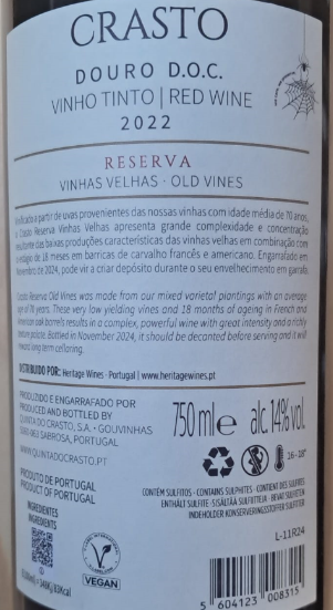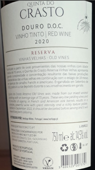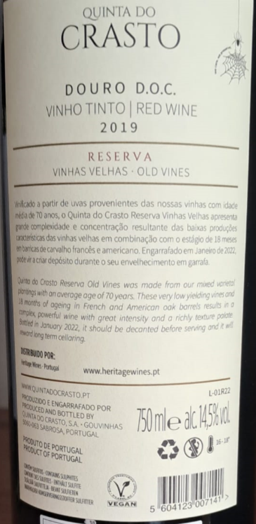 Notasde prova: De cor ruby carregado, apresenta-se muito envolvente no nariz, onde se consegue perceber de imediato a identidade das nossas vinhas velhas. Aroma complexo com notas de esteva fresca, ligeiro cacau, tudo muito bem integrado com frutos silvestres do Douro. Inicia a prova de boca de forma elegante, evoluindo rapidamente para um vinho de grande solidez, onde encontramos um excelente volume e uma estrutura compacta , composta por taninos frescos de textura aveludada. Um vinho de identidade singular que termina harmonioso e muito persistente.